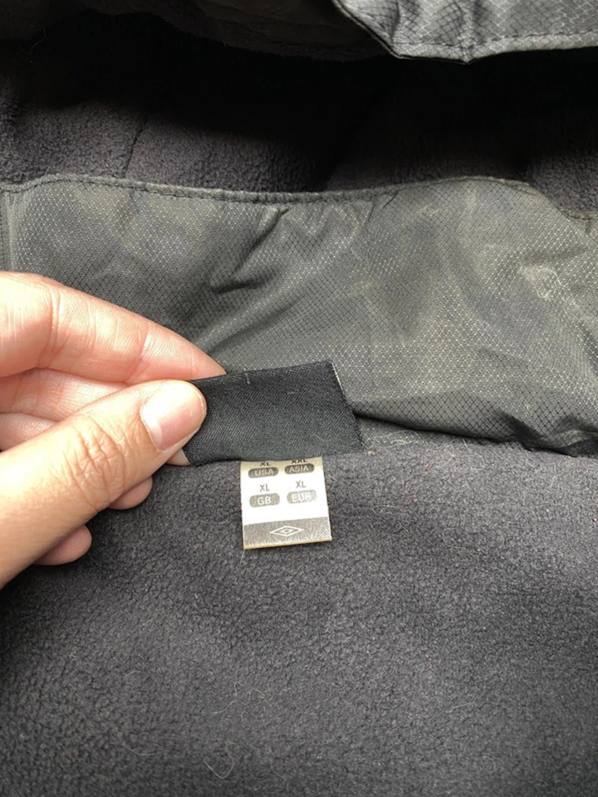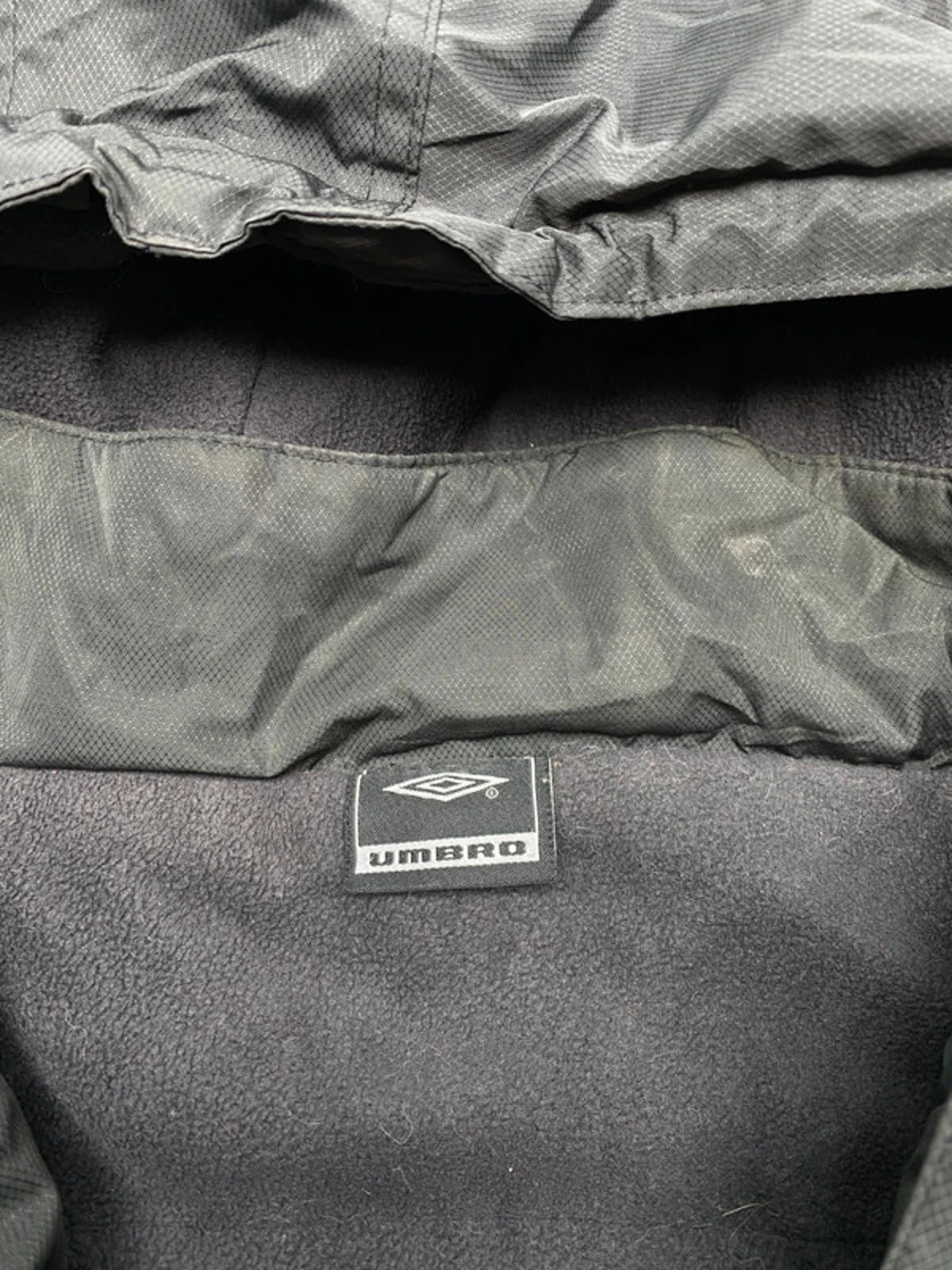 Retro Umbro full-zip hooded winter jacket in black, silver, and red panel design. Features a fleece-lined interior, embroidered chest logo, Umbro sleeve branding, zip front with storm flap, and elastic cuffs/hem for warmth. Perfect for football, terrace wear, or 2000s Y2K streetwear styling. Size: Men’s XL (GB / EU) Condition: Good vintage condition – some light wear and minor marks from age, but overall in great shape and ready to wear.