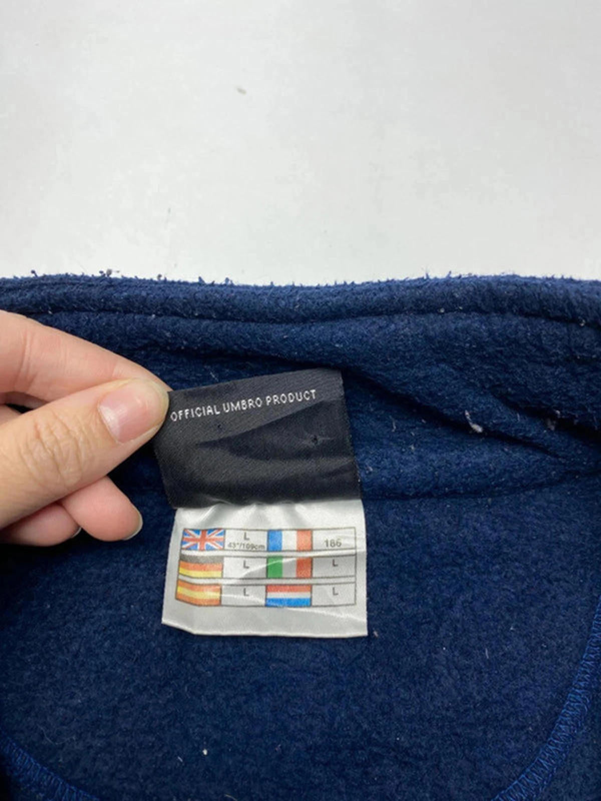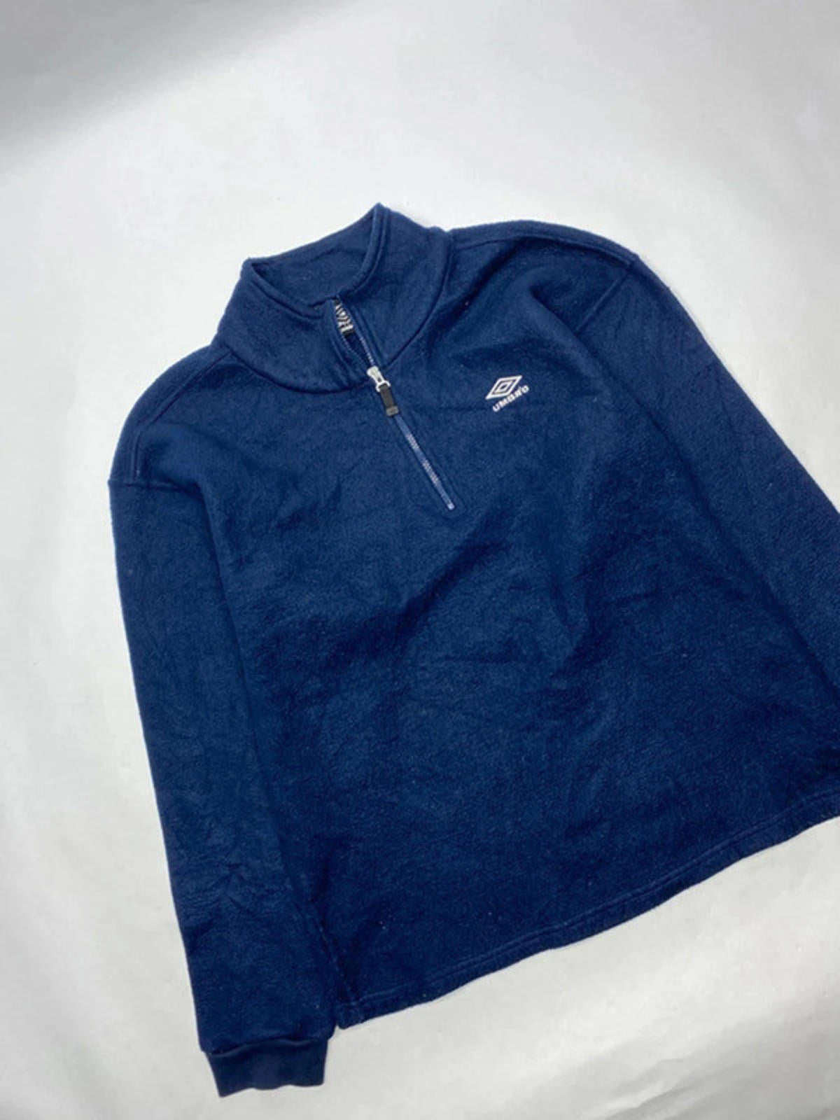 Classic Umbro men's fleece jacket in navy blue. Features a comfortable half-zip design for easy wear and ventilation. Soft fleece material provides warmth and comfort, ideal for cooler weather. Ribbed cuffs ensure a snug fit at the wrists. Embroidered Umbro logos on the chest and sleeve add a sporty touch. Perfect for casual wear or light outdoor activities.
