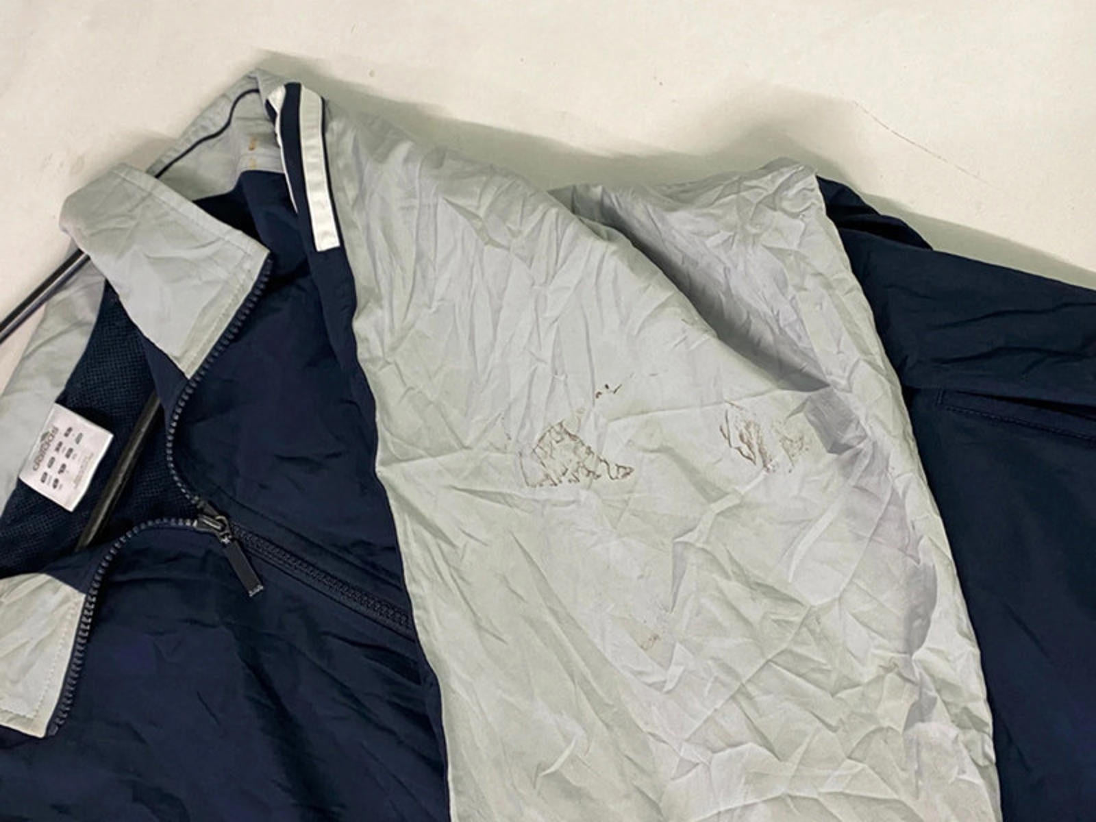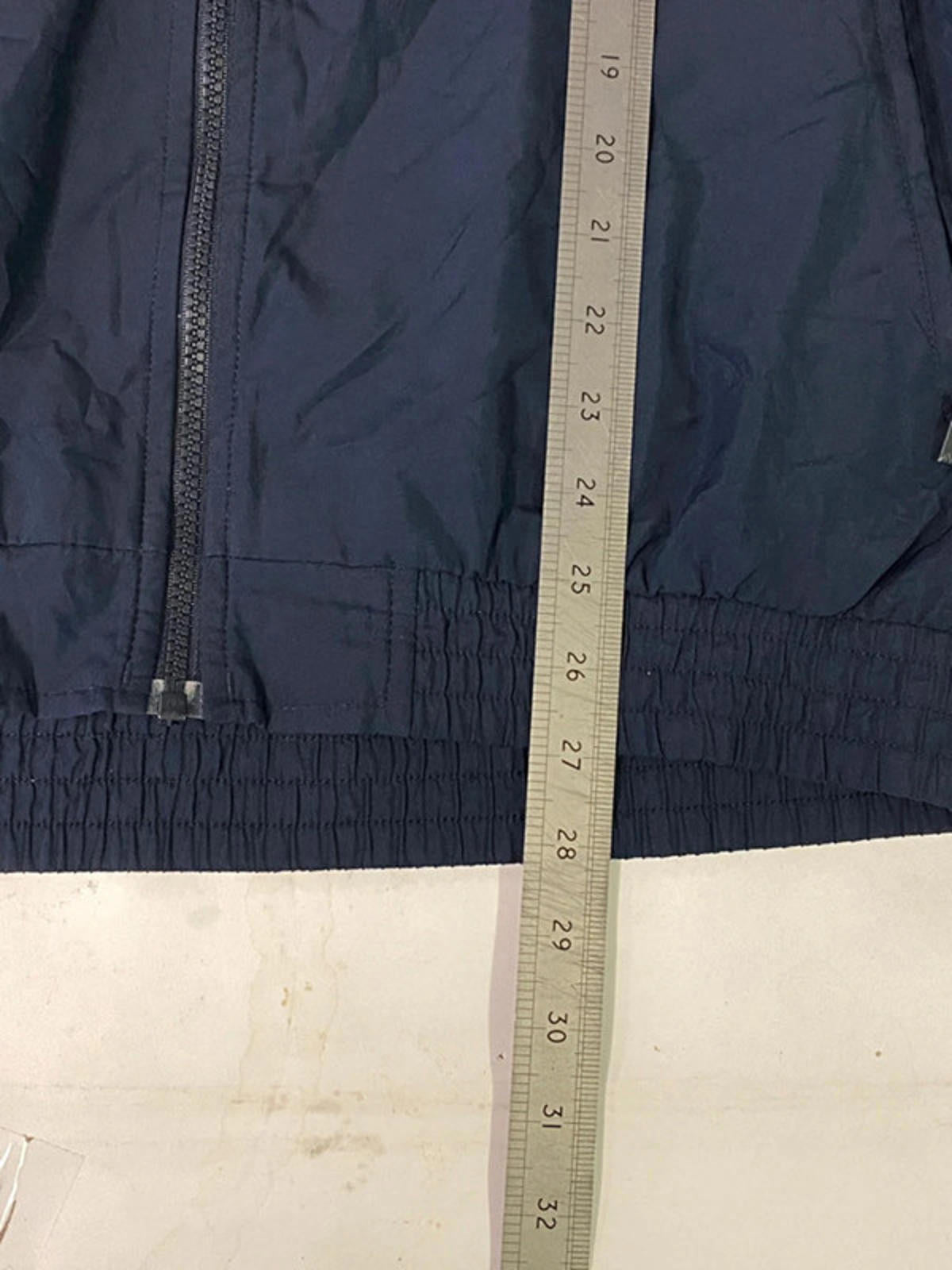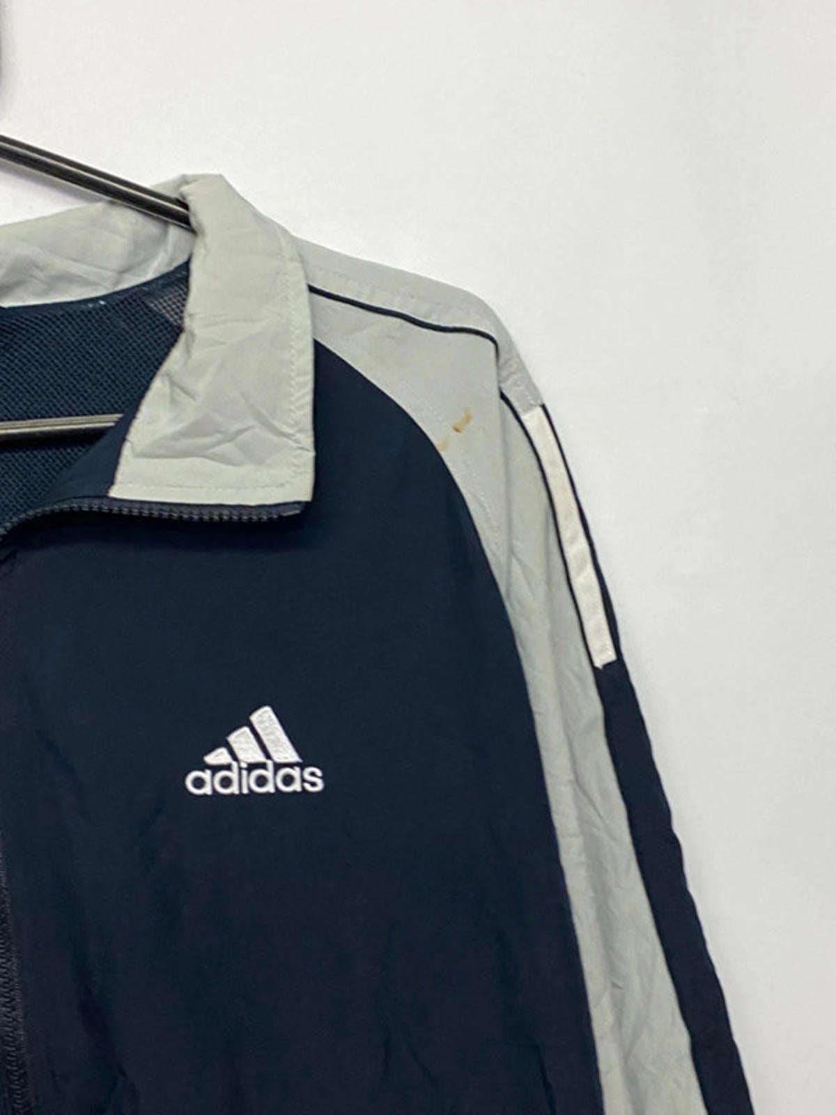 Classic vintage Adidas full-zip track jacket in navy blue with light grey contrast panels on sleeves and shoulders. Features embroidered Adidas logo on the chest, zip pockets, and elastic cuffs/hem. Lightweight with breathable mesh lining, ideal for layering or sportswear. Timeless retro 90s/Y2K style.