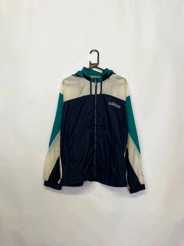 Authentic vintage Adidas windbreaker jacket in a standout navy, teal, and cream color block design. Features full front zip, adjustable hood, lightweight mesh lining, and original Trefoil logo on the chest and tag. Made in Malaysia, size M. Classic 90s retro styling – perfect for vintage streetwear lovers or collectors. Condition is good for its age – some signs of wear and age-related marks on lining and cuffs (see photos).