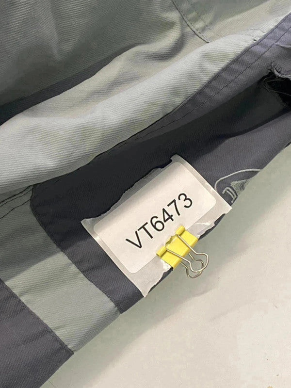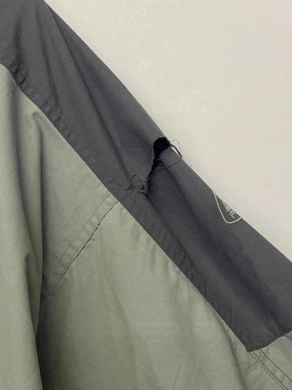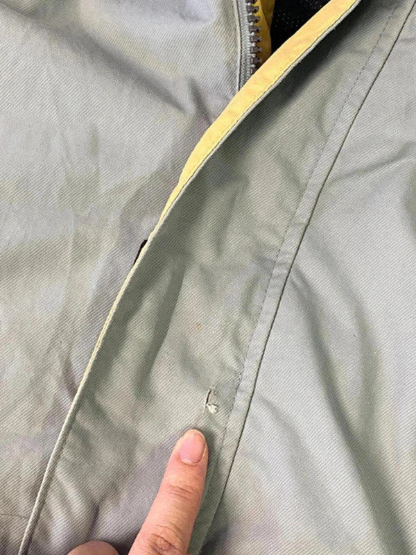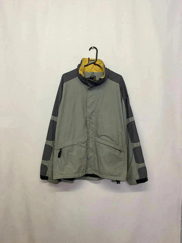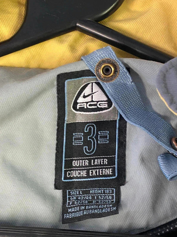 Rare Nike ACG (All Conditions Gear) 3 Outer Layer shell jacket in light grey with dark charcoal panels and a bright yellow inner collar. Designed for harsh outdoor environments – durable, waterproof outer shell with adjustable cuffs, zip + Velcro front closure, and large zippered pockets.