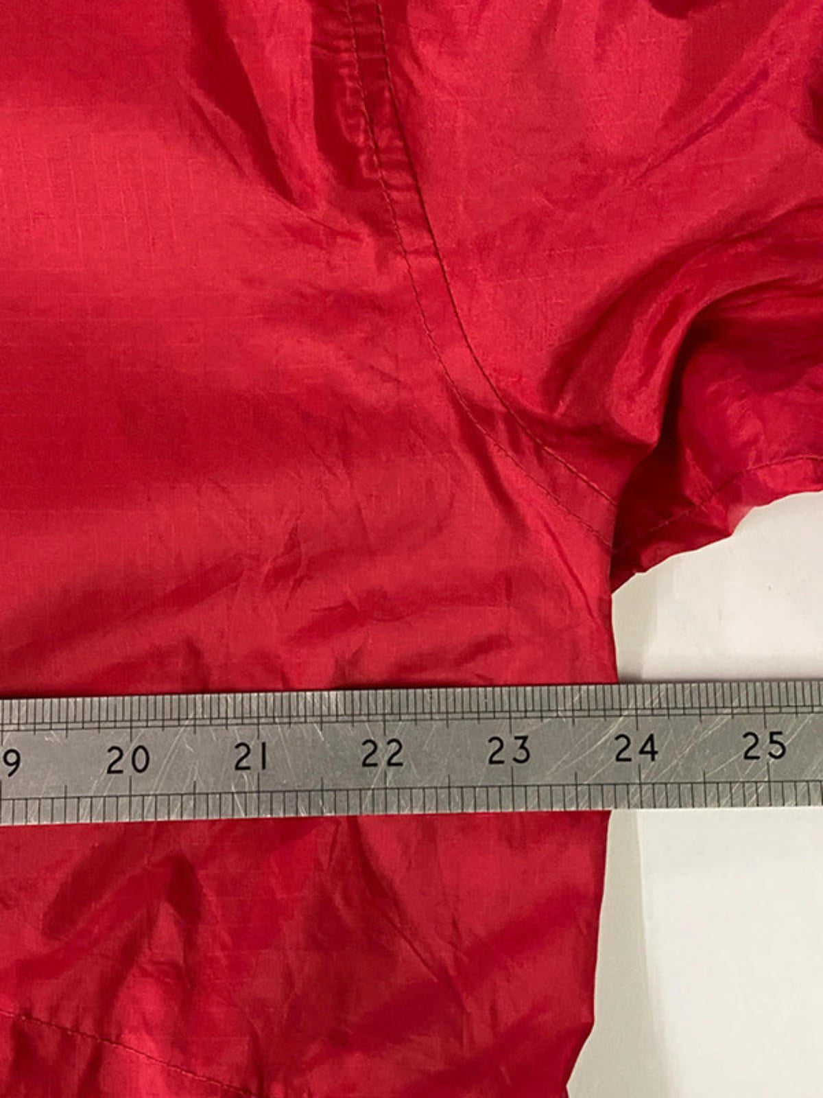 Retro Nike lightweight windbreaker in red with subtle embroidered swoosh logo. Features full zip closure, front pockets, elastic cuffs, and adjustable drawstring hem. Classic minimalist Y2K aesthetic – perfect for sporty fits or casual layering.