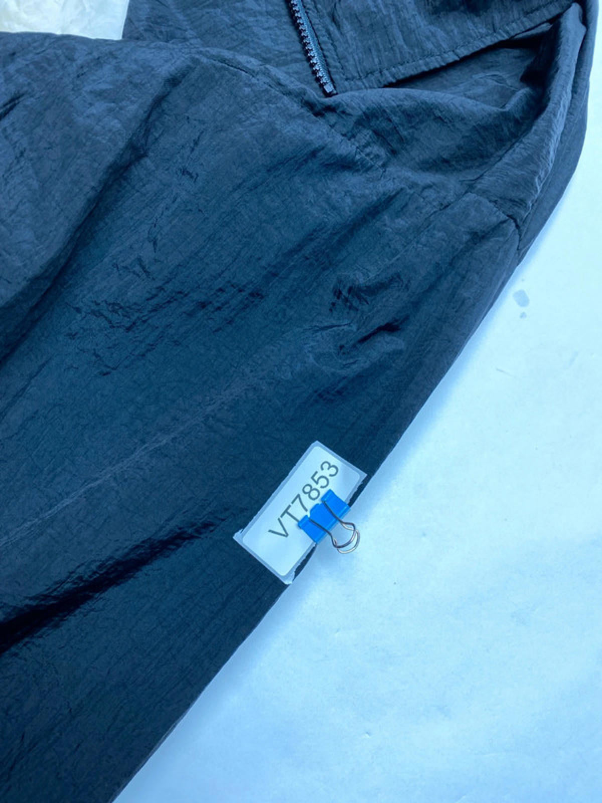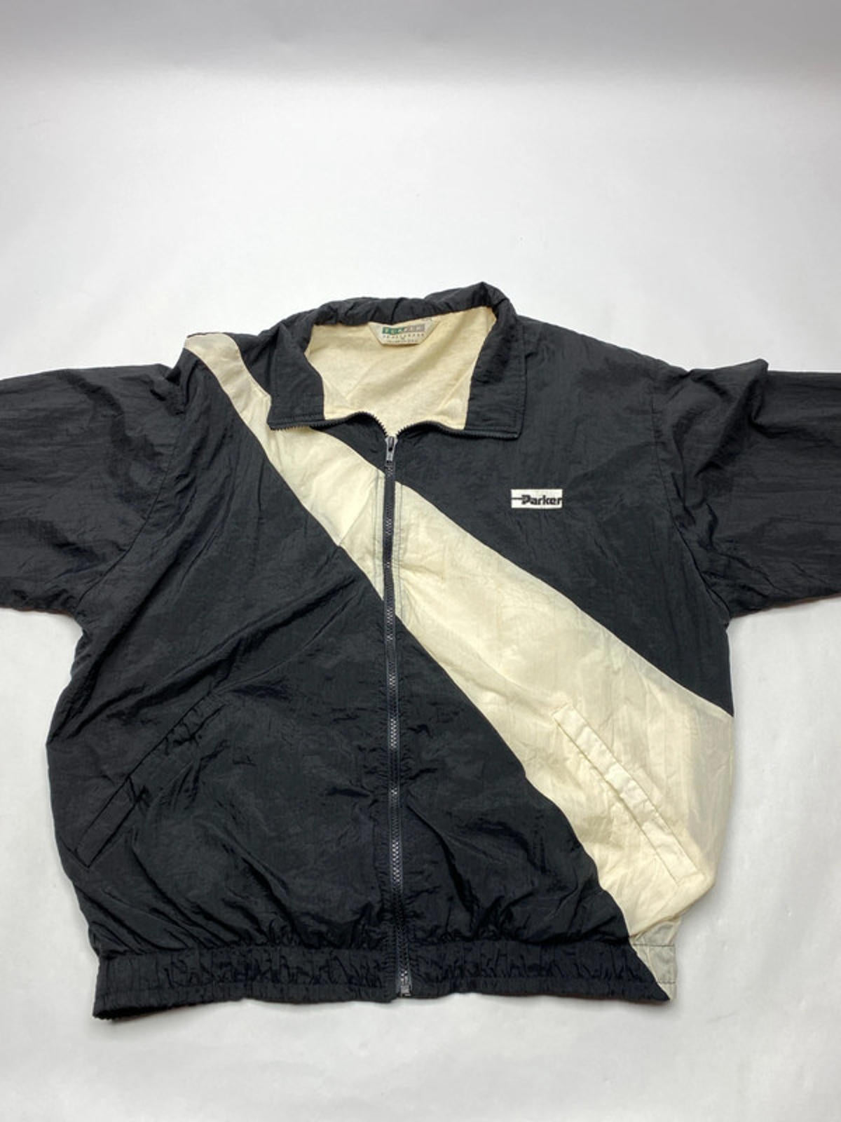 Classic vintage Parker men's windbreaker jacket. Black with cream diagonal stripe design. Lightweight and perfect for transitional weather. Full front zip closure and elasticated cuffs and hem for a secure fit. Ideal for casual wear or outdoor activities. Well-maintained with minimal signs of wear.