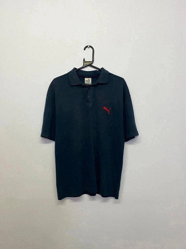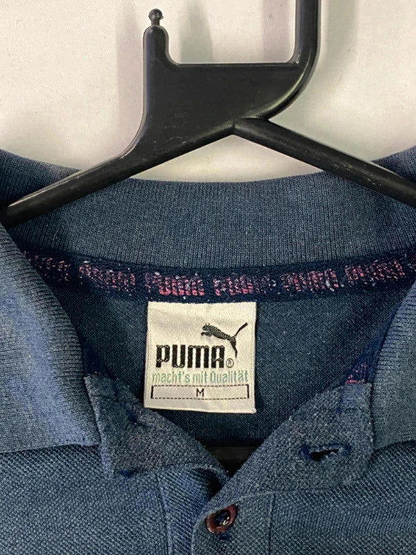Classic vintage Puma short-sleeve polo shirt in a deep navy blue with red embroidered Puma logo on the chest. Made with quality cotton ("macht's mit Qualität" tag) – a nod to Puma’s heritage. Size M – fits true to size.