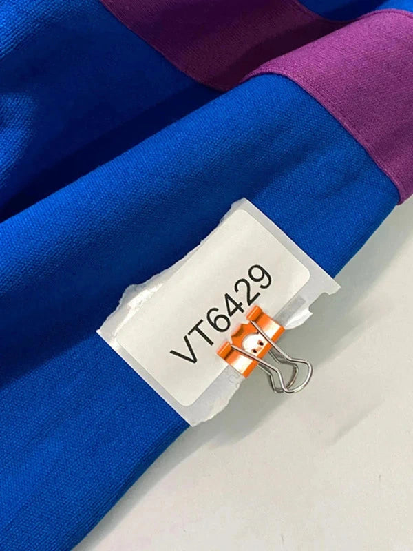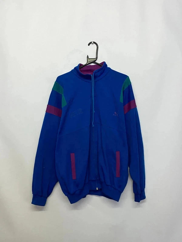 🔵 Eye-catching vintage Puma full-zip track jacket in bold blue with purple and green colourblock panels – classic retro vibes. 💨 Lightweight and sporty, with a drawstring collar and elasticated cuffs/hem.