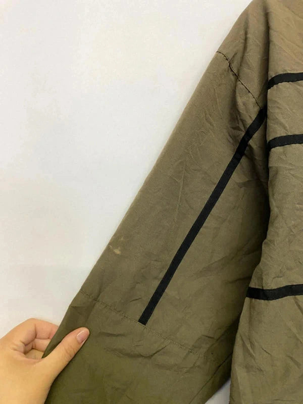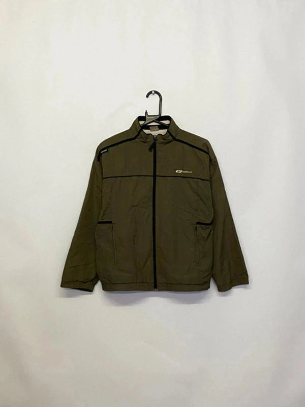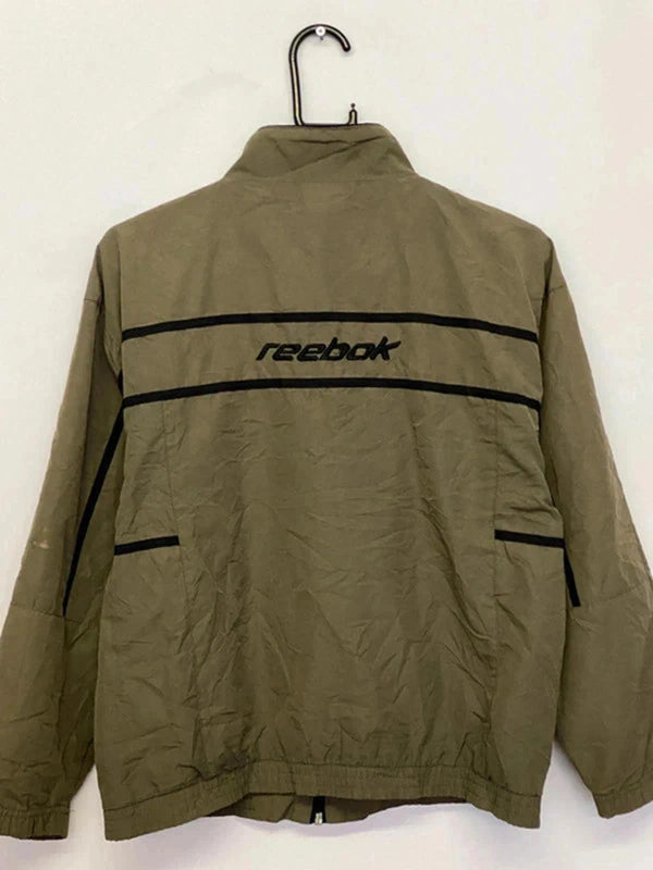 Vintage Reebok windbreaker in olive green with black piping and embroidered chest logo. Features a full front zip, two zippered hand pockets, and a sporty high-neck design. Lightweight and ideal for layering or casual streetwear. Tag states size L – fits age 12 / 152–162 cm (Youth).